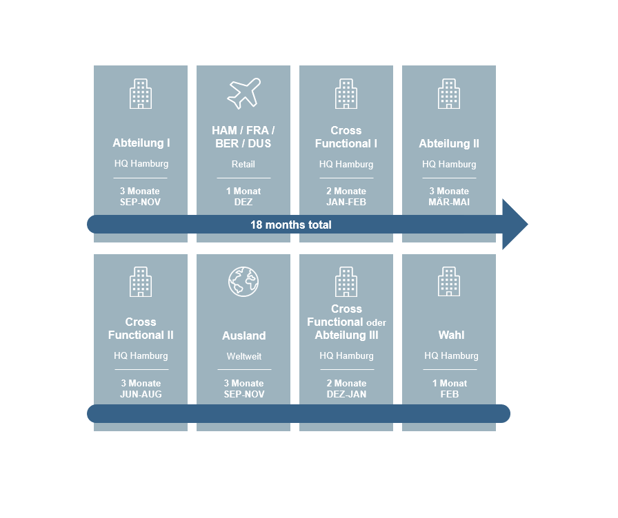 Im Rahmen deines Traineeprogramms erwarten dich 18 spannende und abwechslungsreiche Monate im In und -Ausland. Hier siehst du einen beispielhaften Ablauf.